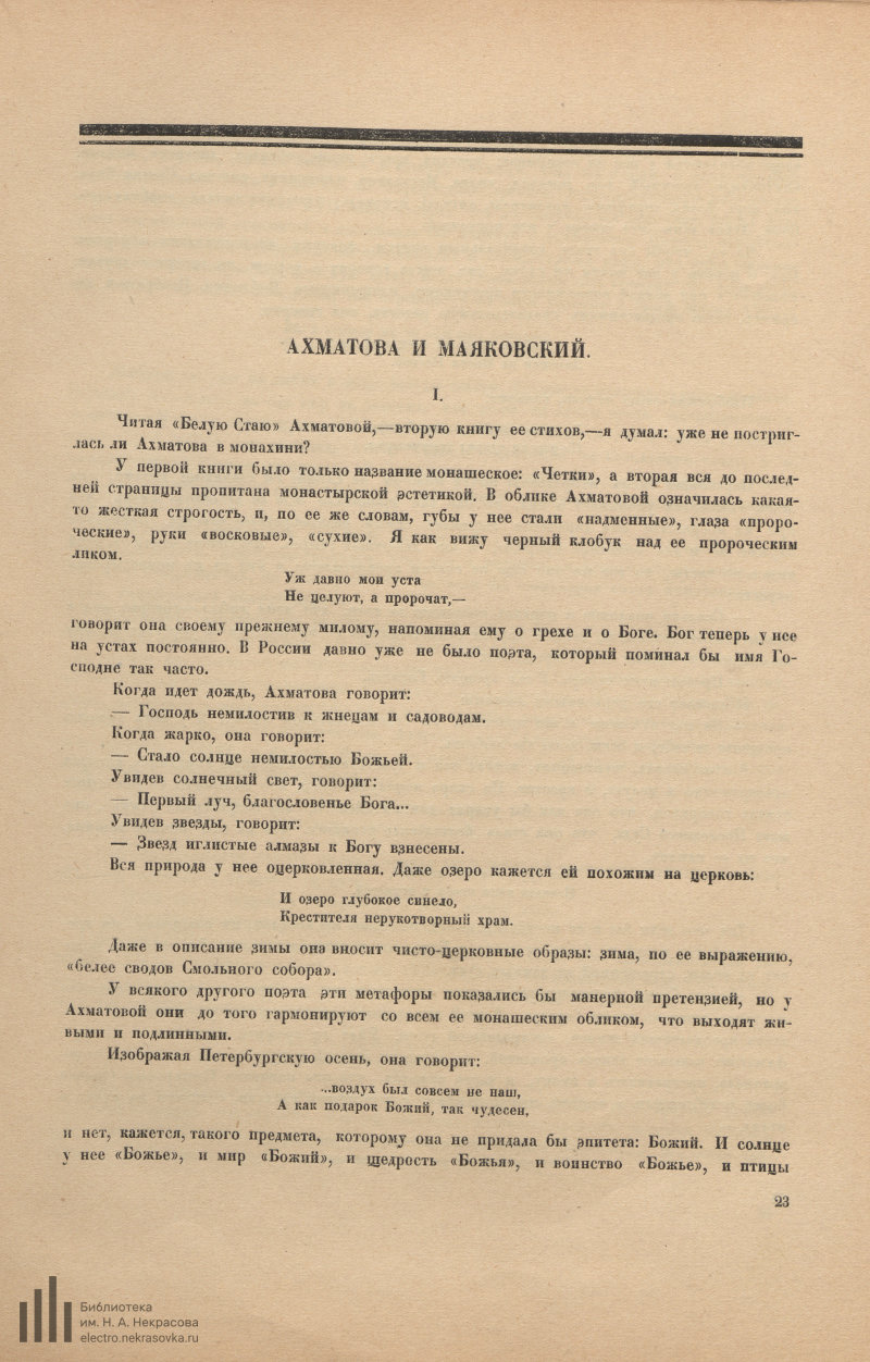 В том же спецхране оказалась и знаменитая статья Корнея Чуковского «Ахматова и Маяковский» из первого номера «Дома искусств», названная в 1993 году Львом Лосевым «самой запомнившейся из недавних публикаций о Маяковском» (она не вошла даже в «полное» собрание сочинений Чуковского, вышедшее в 1965–1969 годы). Сегодня этот номер можно увидеть и прочитать на «Электронекрасовке».