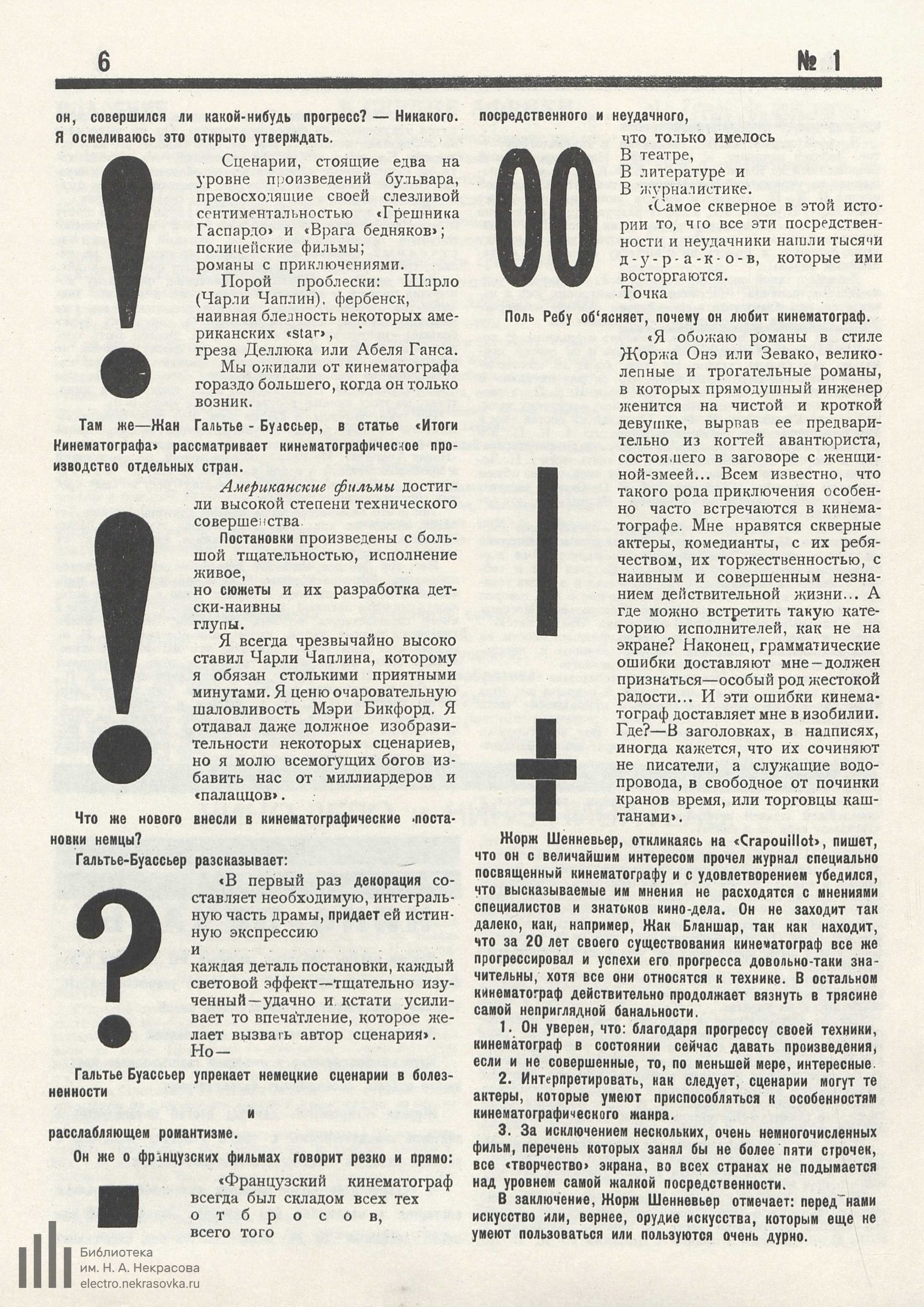Первый номер журнала, вышедший в августе 1922 года, стал программным по ряду факторов — издание задало вектор в оформлении печатной продукции, а его содержание тезисно определило развитие авангардного кинематографа 1920-х годов.
