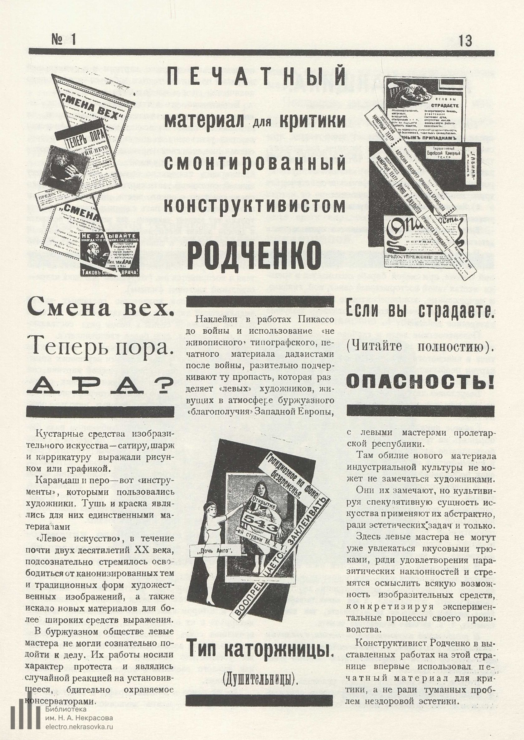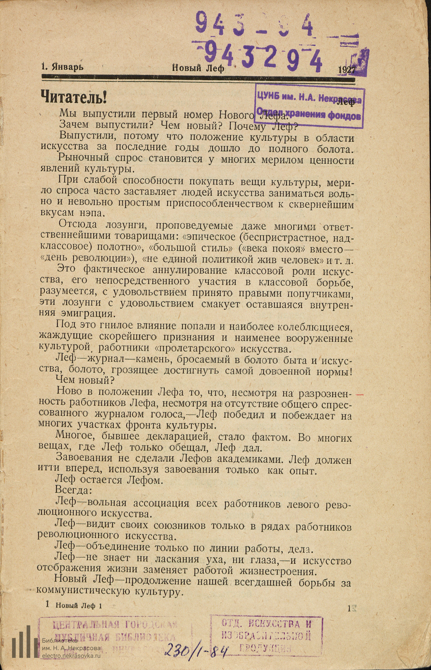 В первом номере журнала за 1927 год, читайте манифест ЛЕФа, письмо Горькому от Маяковского, анонс (нереализованного) мультифото проекта «Самозверей» от Сергея Третьякова, Александра Родченко и Варвары Степановой, проект книжного киоска Антона Лавинского и статьи и произведения других лефовцев.