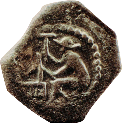 Медное пуло великого князя тверского Бориса Александровича. На оборотной стороне — денежник, чеканящий монеты.