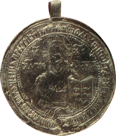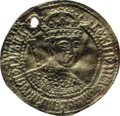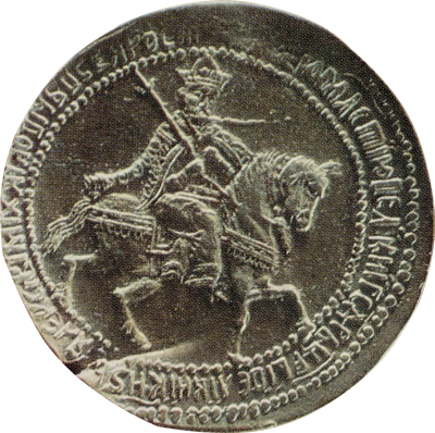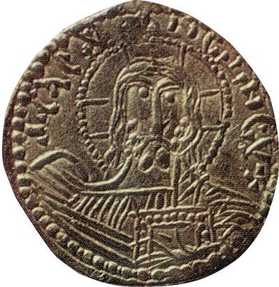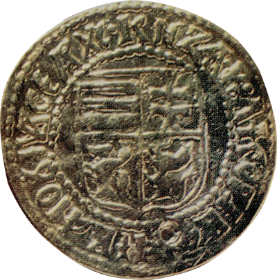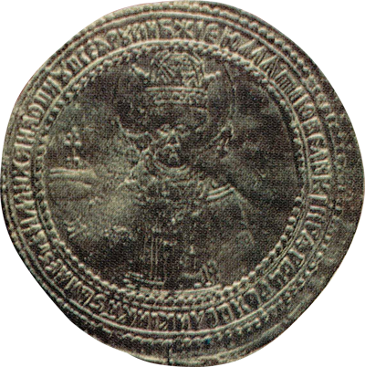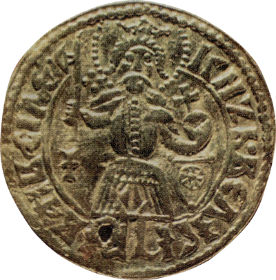 Золотой угорский (дукат) великого князя московского Ивана III Васильевича. Чеканен между 1471 и 1485 гг. Композиция заимствована с венгерского дуката.