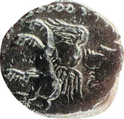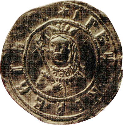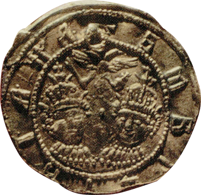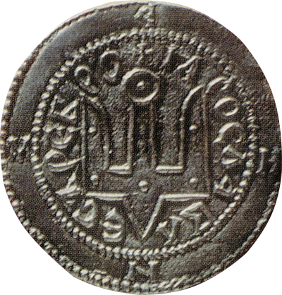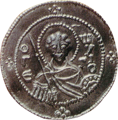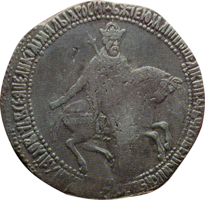 Сребреник новгородского князя Ярослава Владимировича. На лицевой стороне монеты — св. Георгий, на оборотной — родовой знак Рюриковичей и надпись «ярославле сребро».