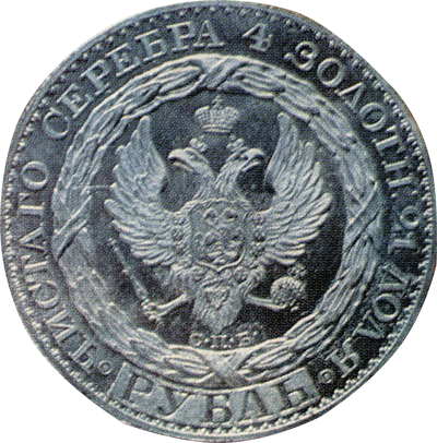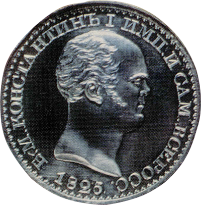 Пробный рубль Константина Павловича. Одна из семи монет, изготовленных Монетным двором после получения известия о смерти Александра I. Штемпели резал Якоб Рейхель.