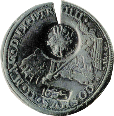 Ефимок царя Алексея Михайловича. Для выплаты жалованья войскам использовались западные серебряные талеры, на которых выбивали «признаки» — русское клеймо и дату. Здесь — талер герцога Тосканы Козимо II.