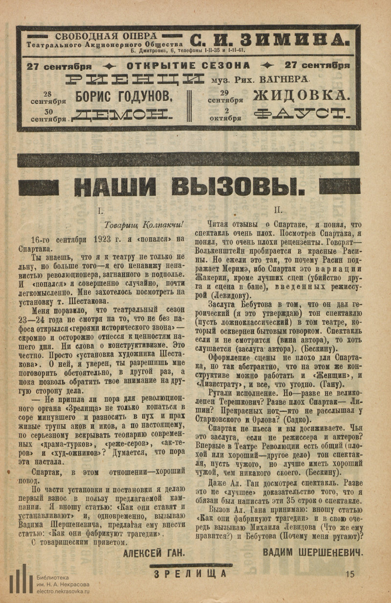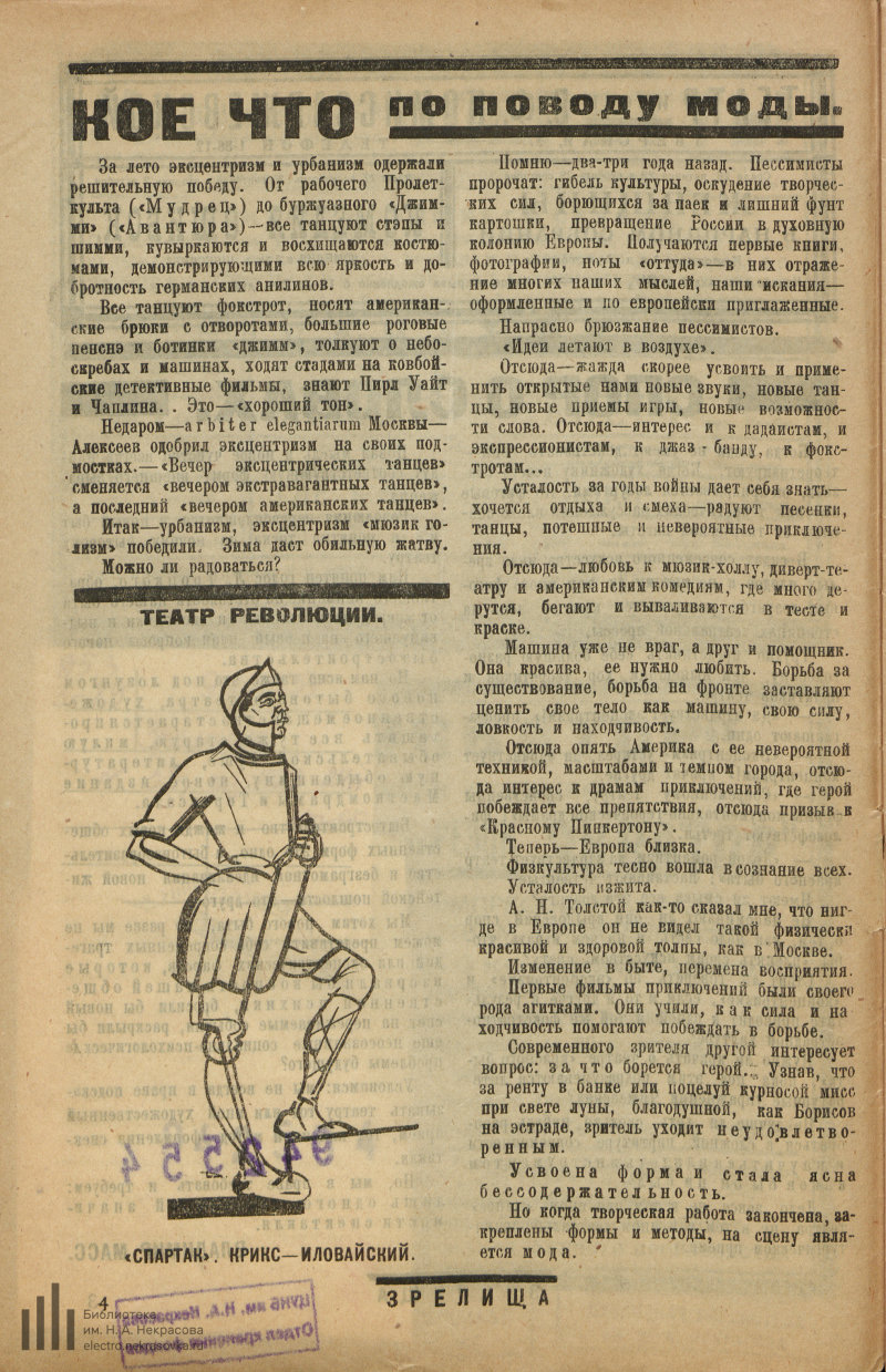В «Зрелищах» № 55 за 1923 год, основатель «Мастфора» и пионер агитпостановок Николай Фореггер рассуждает о моде на мюзик-холлы и веселье, физкультуру и здоровое тело: