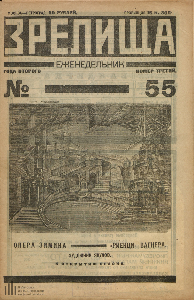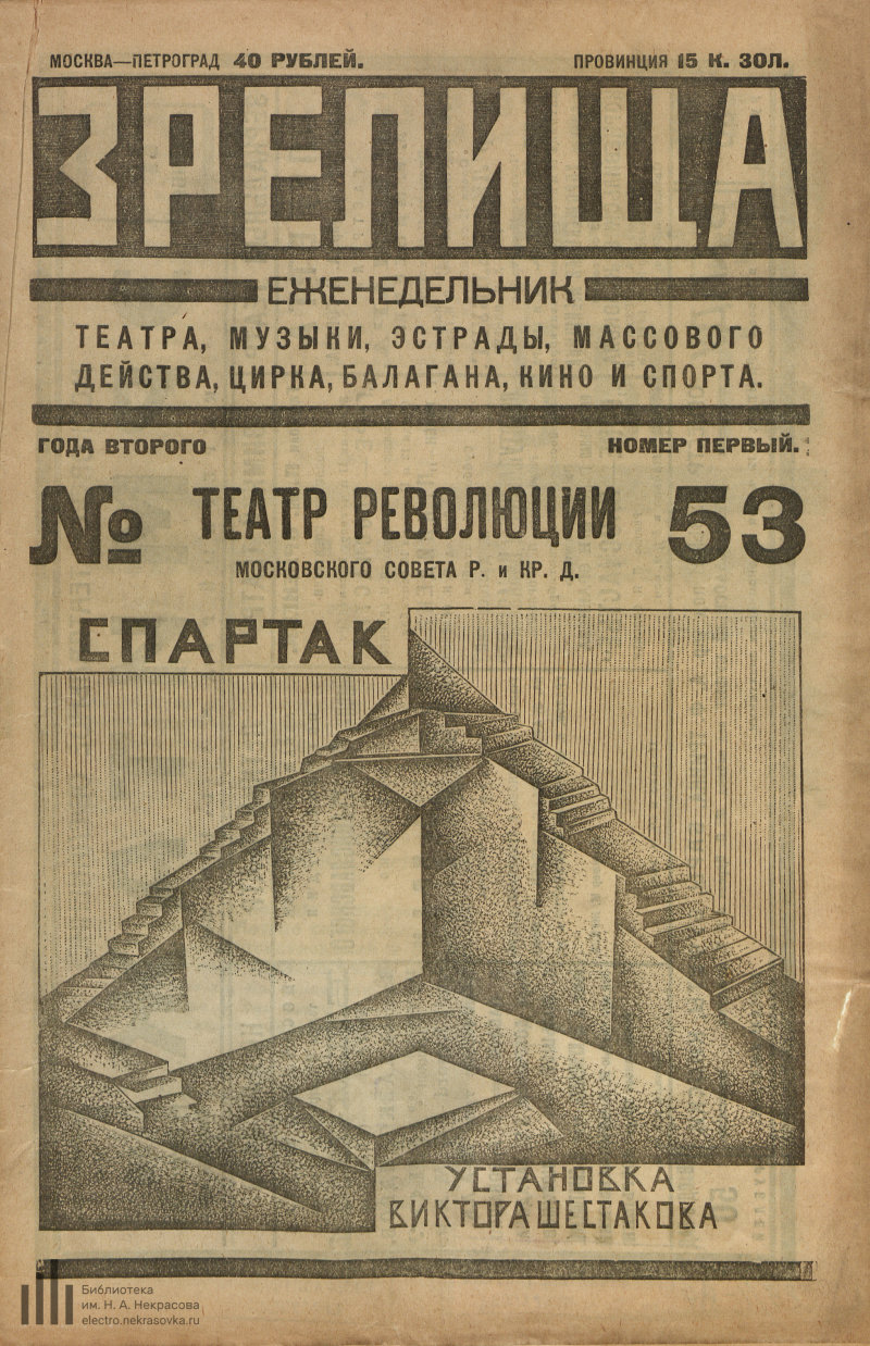 «Зрелища» один из первых советских журналов о массовой культуре. На страницах журнала можно проследить зарождение советской эстрады, как особой формы массового театрального представления. Уходящие понятия «кафе шантан» и «мюзик-холл», и забытые названия мест и коллективов «Синяя блуза», «Кривой Джимми», «Летучая мышь», «Теревсат», «Мастфор».