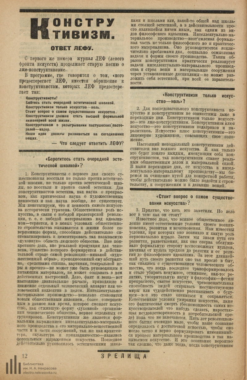 «Конструктивисты с первого дня своего существования восстали не только против эстетической школки, не только против эстетической школы, но восстали и против самой эстетики. Для конструктивистов эстетика, как наука о прекрасном, как критическая наука о художественных ценностях и как наука вообще, не существует. Мы констатируем, что и ценность самого искусства исторически утрачена».